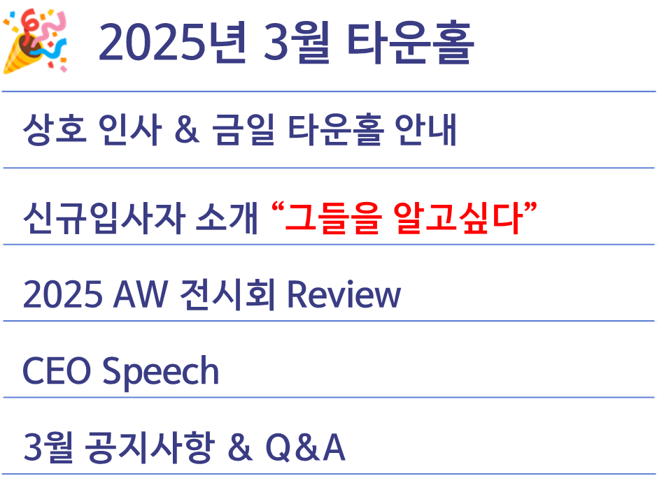 타운홀 하는 날이 가까워지면 과연 이번엔 어떤 이야기를 얘기하고 들을 수 있을까 하는 설렘이 있는데요.
