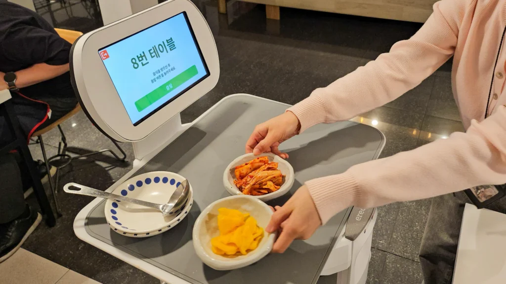 부엌 바로 앞에 항상 대기하고 있는 서빙로봇 이리온에게 밑반찬과 찌개 냄비, 육수 주전자, 기본 밥 등을 올려놓기만 하면 서빙로봇이 바로 손님 테이블로 안전하게 전달합니다.